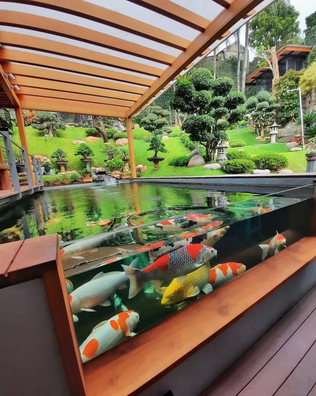 This one is all about pristine presentation. A modern koi pond with clear viewing panels so the fish look like they’re floating in mid‑air. The surrounding greenery and crisp architectural lines make it both zen and luxurious.