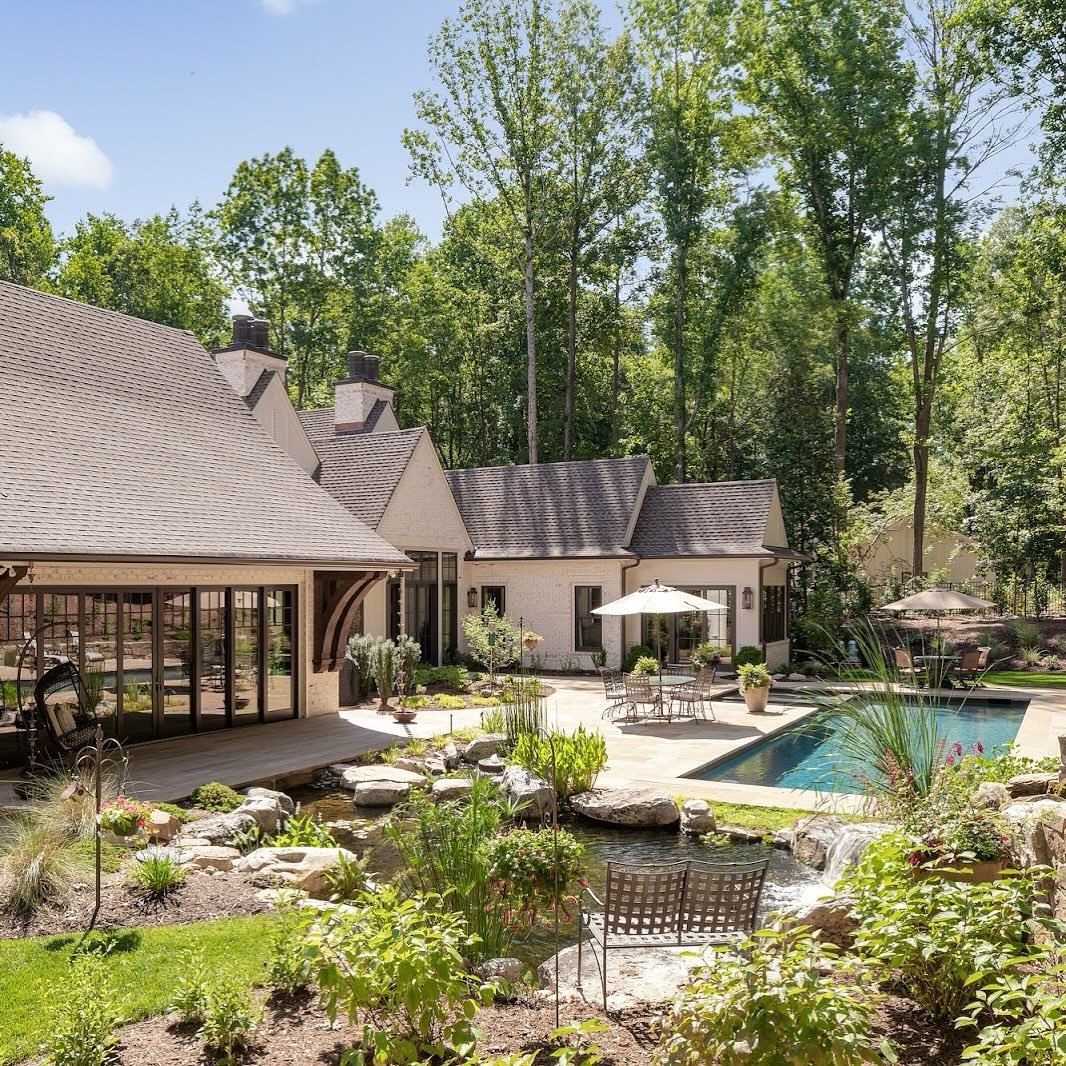 Think luxury retreat, but in your backyard. This design blends a natural stream‑style koi pond into a highly manicured landscape—green lawns, a pool, and a home that looks like it belongs in an architectural magazine spread.