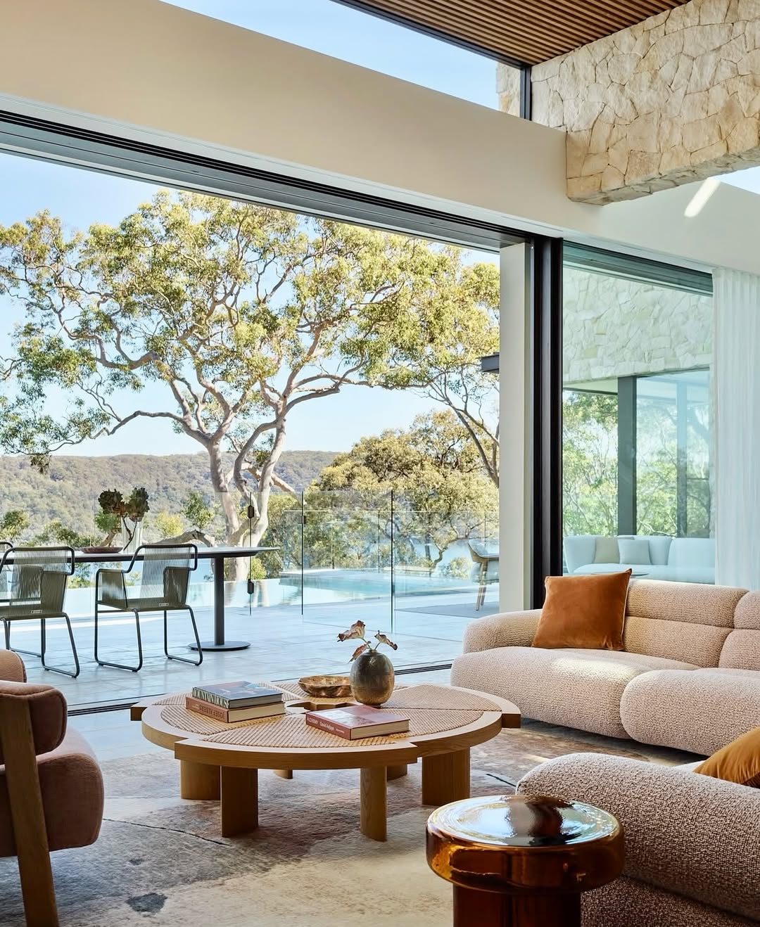 Nothing beats that moment when nature becomes part of the room — and here, the view does half the design work. Soft boucle seating, light woods, and warm sunlit tones echo the landscape outside, making this living area feel like a tranquil retreat.